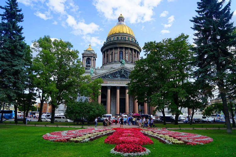 【圣伊萨基耶夫大教堂】:坐落在圣彼得堡市区,外形雄伟壮观,规模令人惊叹。为了建造这座豪华的教 堂,皇室不惜人力、财力、物力,工程中运用了许多新技术和大胆的施工方法,其中用汞合金火烧法为圆顶镀金,使巨大的圆顶在经历一个半世纪之后,即便从未整修依然流光溢彩。教堂的建筑地基深达10米,外部共有112根整块的深玫瑰色和斑环花岗岩圆柱,内部则采用大量珍稀的彩色石料而显得庄重华丽。她与梵蒂冈的圣彼得大教堂、伦敦的圣保罗大教堂、佛罗伦萨的花之圣母大教堂并称为“ 世界四大圆顶教堂”。
